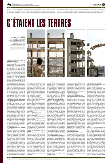 — Le grand papier : C’étaient les Tertres. Bagneux, à 3 km au sud de Paris. 37000 habitants, 51% de logements sociaux. Construits en 1957 par les architectes Guillaume Gillet et André Gomis, les Tertres étaient une barre monumentale de 365 mètres de longueur : une cité — avec tous les clichés afférents. Dans le cadre de la politique de rénovation urbaine, la destruction des Tertres a été décidée. Aux Tertres, le jour du lancement de la démolition, Le Tigre a croisé deux jeunes filles, dont une ancienne habitante du lieu.