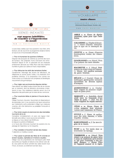 Numéro double, décembre 2014-janvier 2015, du Tigre, magazine en couleurs de 84 pages, sans publicité. Ce numéro marque la fin de la série en kiosques, cf. l’éditorial en ligne. Avec au sommaire : — Hôtel BHL, une pièce de théâtre de Bernard-Henri Lévy, récit par Adrien Absolu Feuilletons : — Mexico : F.F.C.C. de Cuernavaca : Tant de mots pour si peu de kilomètres, par Raphaël Meltz Images : — Burnout par Simon Davidson (et couverture) Et les chroniques d’Eric Chevillard, L’Hippopotable, Goria, Antoine Zéo, Killoffer, Placid, Charles Berberian, Simon Roussin, Marie Chéné, Renaud Wattwiller, Gianpaolo Pagni, Aurore Valade & Christian Fusco, Julien Donada, Hélène Briscoe, Yann Kebbi, Franck Stevens, Frédéric Danos, Paul Martin, Rocco, Jean-Paul Lapin, Francis Frog, David Poullard & Guillaume Rannou. Les archives du Tigre sont gratuites: consultez les anciens numéros. Vous pouvez acheter ce numéro en PDF. |