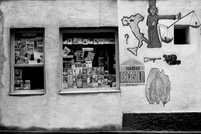| ORGOSOLO. Corso Repubblica. Peinture réalisée par le groupe DIONISO en 1969. Photo d’époque ; la peinture n’est plus visible aujourd’hui. |