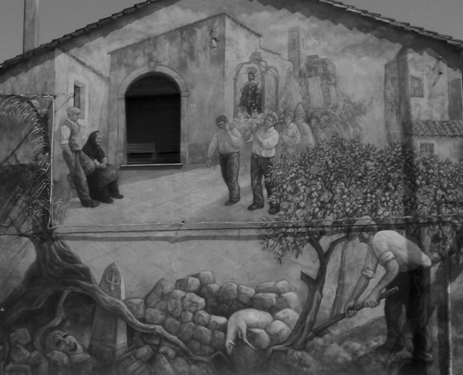 Les premières peintures murales naissent de cette expérience de partage. Chaque peinture correspond à un événement de la vie du village : fête populaire, élections... Progressivement, les murs du petit village de Sardaigne se font les porteparole d’une histoire, celle de la ville et de ses citoyens.