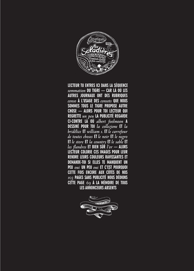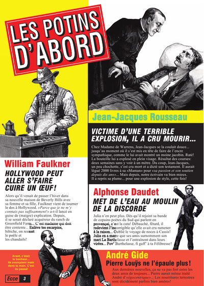 Coulisses : Elysée. Scoop ! Discours de Nicolas Sarkozy, diffusé sur TF1, le 24 avril 2008 en direct de l’Élysée. Le Tigre avait une taupe parmi les techniciens. Voici donc le off du discours officiel : ce qui se dit, ce qui s’entend, sur le plateau du tournage. Où l’on parle de la calvitie de PPDA, d’un bacon cheese, d’un balai sur les graviers et de quatre canards sur la pelouse.. Le dossier du Tigre : Mythique. Le récit des errances d’un adepte masculin du site de rencontres Meetic. Où il est question de sensations plus que de poncifs sur les sentiments. En outre, dans ce dossier, des données chiffrées inédites : yeux, nez, cheveux, salaire, études, goûts musicaux, habitudes culinaires... qui cherche quoi ? quels critères sont déterminants ? lesquels ne le sont pas ? Enfin, un florilège de petites annonces féminines et masculines... Voyeurs, à vos deux yeux ! Reportage photo : Lapins. En Inde, à Pondichéry, une trentaine de lapins a envahi la ville et se déplace d’un quartier à l’autre au gré de décisions administratives. Ces drôles de lapins surmontent le réceptacle de poubelles municipales. Le photographe Philémon, du Bureau d’Investigation Photographique, est parti traquer ces animaux urbains pour le moins inattendus et poétiques. Les murs ont la parole : Islam. Les ethnologues Pierre Centlivres et Micheline Centlivres-Demont évoquent un aspect de l’imagerie populaire en islam : celle des estampes religieuses vendues dans les rues et bazars des grandes villes du monde musulman. Des images aux couleurs vives et aux styles variés, qui renvoient à un monde de symboles et de récits issus de la tradition islamique. Supplément de l’été : Voici ! Vous en aviez rêvé, Le Tigre l’a célébré : l’heureux mariage de la presse people et du savoir. Six pages 100% people d’histoires d’amour, de gloire et d’amitiés rompues... Sauf que Britney Spears y cède la place à George Sand et Leonardo DiCaprio à Gustave Flaubert... Le tout à base d’anecdotes sulfureuses garanties véridiques ! L’énigme : Catch. Pour les lecteurs qui en douteraient encore : cette rubrique du Tigre propose de vraies énigmes policières. Ce mois-ci encore, hélas, un crime sanglant a été commis sur la place publique. À vous de le résoudre tel Sherlock Holmes, très patiemment, stylo en main, en étudiant l’un après l’autre les mobiles possibles, les alibis, les incohérences temporelles... L’incroyable almanach : Pêchu. On a la pêche. D’où des fruits goûteux, d’où des eaux poissonneuses, d’où des filles pécheresses, d’où des fils de cannes à pêche, d’où des aiguilles, d’où des péchés, d’où des noyaux, d’où des cannes, d’où Chaplin, d’où des moustaches, d’où des tigres. C’est le bric-à-brac de l’incroyable almanach, et ce n’est pas si inutile qu’on veut bien le croire. Quelques collaborateurs de ce numéro : DESSINATEURS Albert Foolmoon, Euxin, Martin Lebrun, Vincent Sorel PHOTOGRAPHES Patrick Devresse, Bruno Elisabeth, Philémon, Tendance floue, Stéphane Zaubitzer GRAPHISTES L’Hippopotable, Capucine Merckenbrack AUTEURS & CHRONIQUEURS Éric Chevillard, Pierre Centlivres, Micheline Centlivres-Demont, Oregor Doblebaq, Jean Benoît Dujol, Sandor Krasna, Raphaël Meltz, Pacôme Thiellement, Lætitia Bianchi, M. Vandermeulen, Jules Yves, etc. |